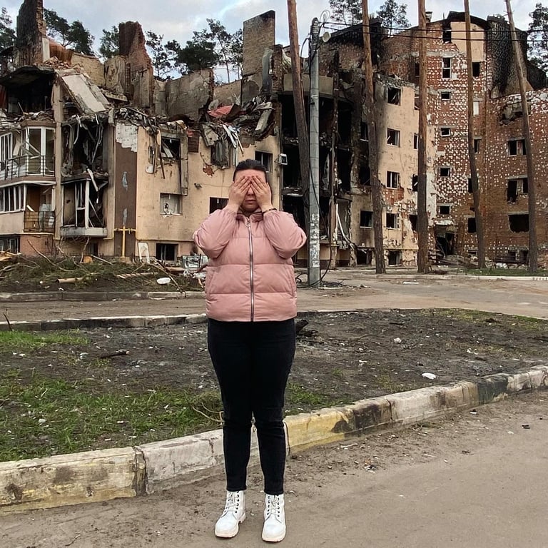 Я повернулася в Київ. Під час першої поїздки в Бучу та Ірпінь вирішила робити фото, на яких руками закриваю очі. Пізніше підпишу їх — "Я відмовляюся це бачити".
