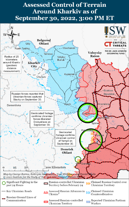 30 вересня російські сили продовжували відходити з позицій навколо Лимана, оскільки українські сили продовжували охоплювати російські війська в цьому районі.