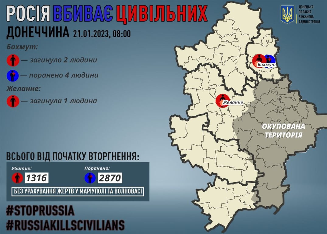 Протягом 20 січня російські окупаційні війська обстрілювали територію Донецької області. Внаслідок обстрілів загинуло три мирних мешканці регіону, ще чотири отримали поранення.