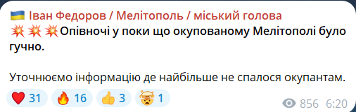 Міський голова Мелітополя Іван Федоров заявив, що лунали гучні вибухи в тимчасово окупованому Мелітополі. За його словами, це сталося сьогодні о півночі.