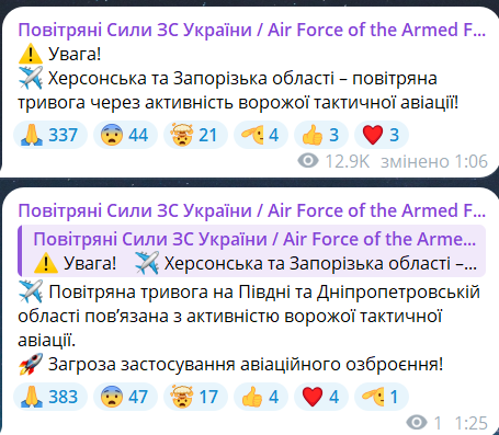 Скриншот повідомлення з телеграм-каналу "Повітряні сили ЗС України"