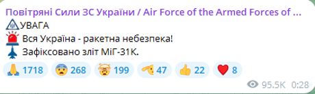 'post': <Post: Ракетна загроза по всій Україні — окупанти підняли в повітря винищувач МіГ-31К>,
