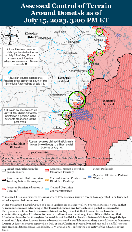 Также российские войска продолжали ограниченные наступательные операции на линии Донецк — Авдеевка, но не достигли никаких территориальных достижений.