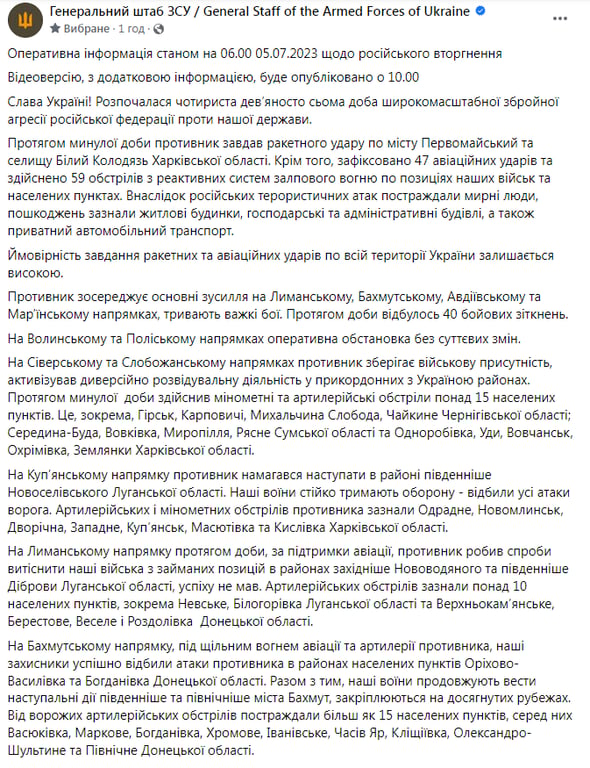Утренняя сводка Генштаба за 5 июля 2023 года