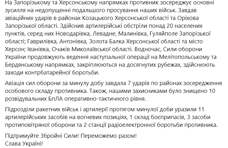 Кроме того, в Генштабе добавили, что вероятность вражеских обстрелов территории Украины остается высокой.