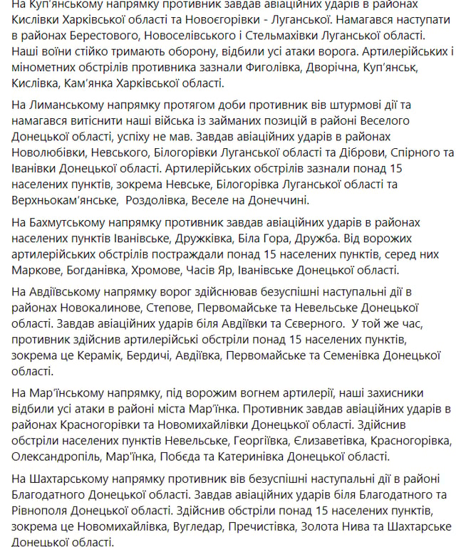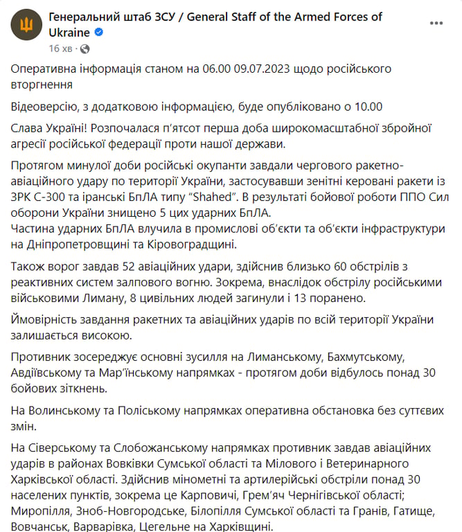 "Также враг нанес 52 авиационных удара, совершил около 60 обстрелов из реактивных систем залпового огня. В частности, в результате обстрела российскими военными Лимана, 8 гражданских людей погибли и 13 ранены", — говорится в сообщении учреждения.