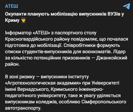 В Крыму враг планирует мобилизовать выпускников вузов, — "Атеш"