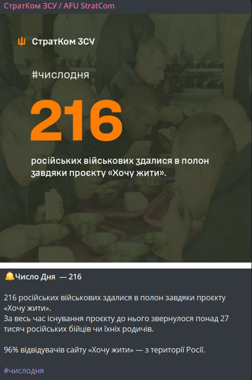"Число дня — 216. Именно 216 российских военных сдались в плен благодаря проекту "Хочу жить", — говорится в сообщении.