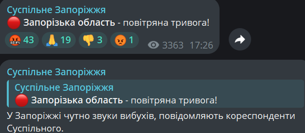 Сообщение о воздушной тревоге и взрывах. Фото: скриншот поста Суспільного