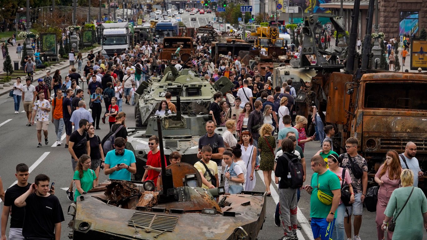 Пока Украина готовилась праздновать День Независимости, даже когда ее военные силы противостояли российскому вторжению, которое длилось уже несколько месяцев, чиновники собрали грандиозную, но ужасную выставку на Крещатике, главной улице столицы Украины.