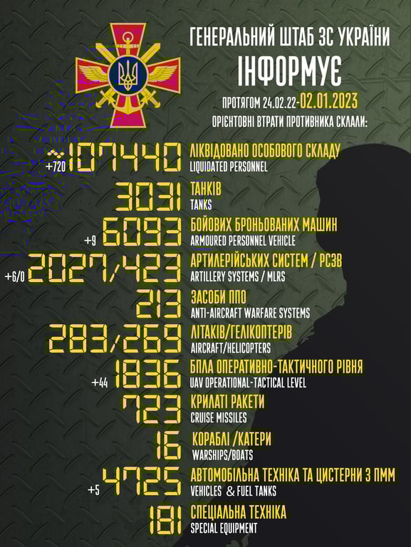 За 1 января украинские защитники уничтожили на фронтах войны более 700 российских оккупантов.