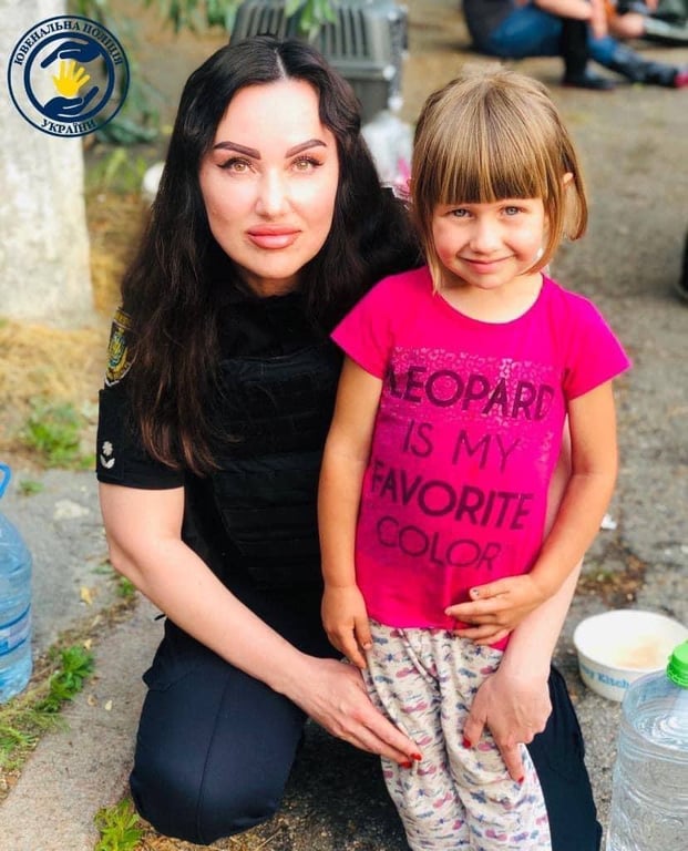 Врятована дівчинка з Олешків із поліцейською. Фото: МВС