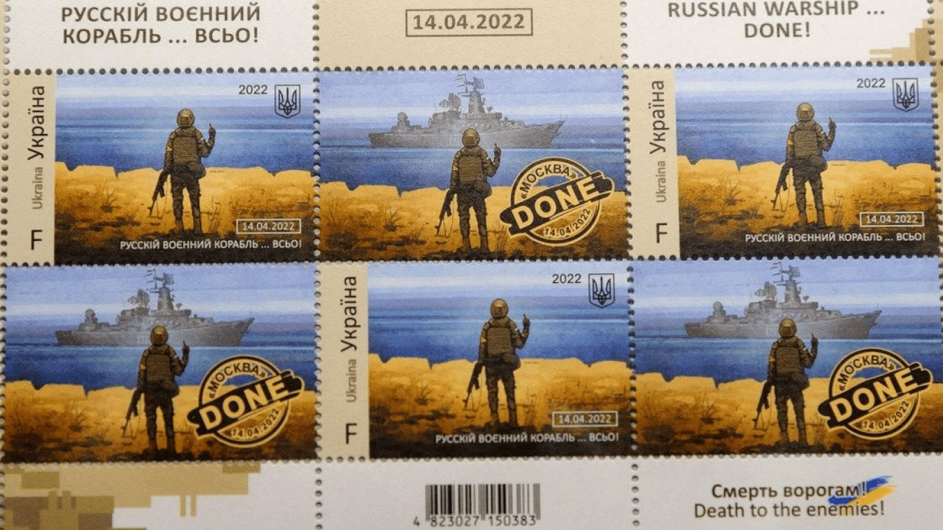 "Нагадаємо, поштова марка "Російський військовий корабель, йди…!", яку сміливо можемо називати легендарною — перша марка Укрпошти, введена в обіг 12 квітня 2022 року в умовах військового стану", —зазначили в Укрпошті.