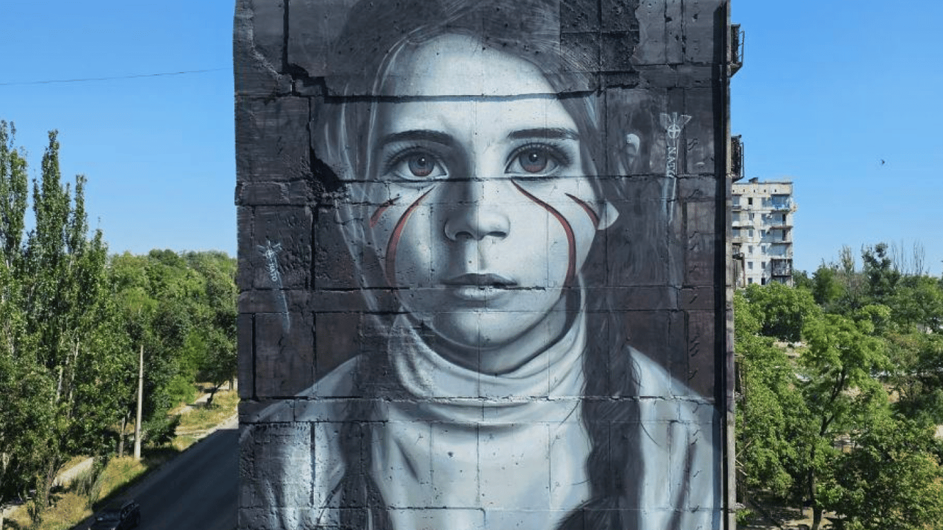 В окупованому Маріуполі італійський художник завершив роботу над величезним розписом, що зображує дівчину під обстрілом НАТО. Художник, який активно реалізує свої проєкти в Росії, відомий як Jorit.