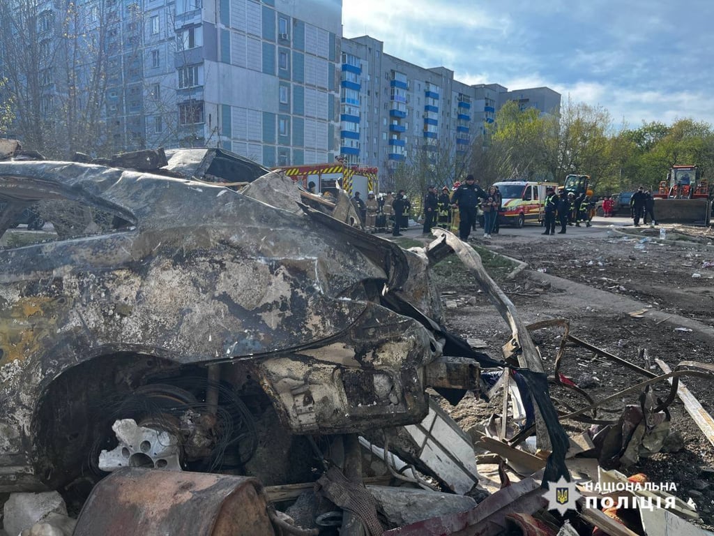 Наслідки ракетної атаки росіян в Умані 28 квітня. Фото: Нацполіція